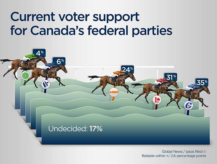 However, if the federal election were tomorrow, 35 per cent of Canadians would vote Conservative (up two points from December) while 31 per cent would choose to elect the Liberal candidate (down three points from December), the poll suggested.